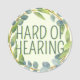 This circle badge features the slogan 'Hard of Hearing' in a narrow font, surrounded by a green wreath of leaves, on a pale green background. You can edit the text as needed. A great gift for a loved one who is deaf or who wears hearing aids. ⭐ For more useful deafness accessories, visit my store Zazzle.com/Elder_Vitality ⭐ For custom orders, message me on Zazzle