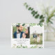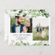 This elegant, black and white wedding thank you postcard features a spot for two of your favourite personal photos and lots of watercolor green foliage.