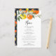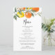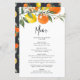 Botanical menu card perfect for summer weddings and other events. It features watercolour illustrations of oranges, lemons, orange blossoms and greenery with a matching citrus pattern. Personalise this citrus menu card by adding names, date, time and other menu details.