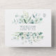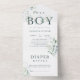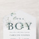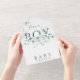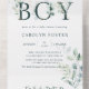 This all in one baby shower invitation card features painted watercolor eucalyptus and green leaves with botanical green letters. For more advanced customisation of this design, please click Customise Further link to change font, size, and colour.