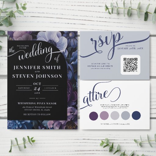 Adorned with the intricate gothic floral patterns that define the "Botanical Moonlight" suite, this enclosure card is a work of art in itself. The luxurious purple and black colour scheme echoes the deep and romantic hues of an autumn evening, setting the tone for your special day.