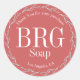 Delicate botanical round frame with customisable Thank you for your purchase text, monogram initials, type of product, in this case soap, and location where business started. Ideal for after purchase packaging. White lettering on indian red or chestnut rose background.