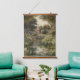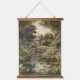 vintage painting of a botanical scene of swans swimming in the water in an English garden with water lilies, bridges and many exotic flowers