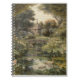 vintage painting of a botanical scene of swans swimming in the water in an English garden with water lilies, bridges and many exotic flowers