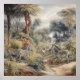 vintage painting of a botanical scene with zebras in an oasis with palm trees and a river