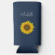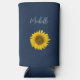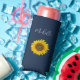 Elegant navy blue personalised seltzer can cooler with a yellow sunflower bloom image.. This lovely botanical item has white customisable script lettering with an elegant script. Perfect for enjoying your favourite cold beverage.