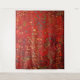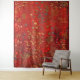 Large scale foliage, and flowers in bright colours of gold, green, red, and blue against a red background. Inspired by historical textiles. Evokes a warm, decadent, bohemian interior and a wild country garden.