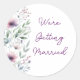 An elegant watercolor plum purple flowers with sage green and dusty blue foliage and floral design wedding we're getting married stickers to seal wedding invitation envelopes.