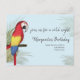 This design features a cute wild birds animal party, a tropical beach pool outdoor party, a colourful jungle parrot wildlife cute, a simple minimalist minimal modern, a stylish trendy calligraphy script, a botanical palm tree leaves leaf, with tropical green greenery foliage, a whimsical cute fun party invitations, a simple fun summer birthday party, a botanical jungle paradise island a budget-friendly postcard