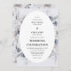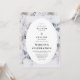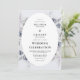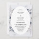 Botanical Winter Wedding Invitation. Design features a white oval framed with botanical watercolor florals and festive foliage. Moody shades of grey, bues and browns create a wintery vibe and the simple template is easy to customise.