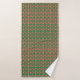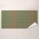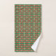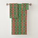 Alt text: "Two towels, one large and one small, both with a festive red, green, and white diamond pattern. Towel set hanging on a rod and a matching washcloth displayed flat."