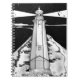 A black and white illustration of the lighthouse at the end of the boulder bank in Nelson, New Zealand. This lighthouse is at the cut near and has haulashore island in the background.