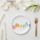 These festive paper plates feature a gender neutral rainbow bounce graphic in red, orange, yellow, green, blue and purple lettering and an editable area for age inside of the O. Perfect for children's, kids birthday parties at bounce houses or trampoline parties. Pairs perfectly with the bounce birthday party collection by Stacey Meacham. Click edit to customise.