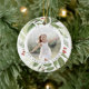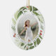 Elegant holiday photo ornament features a favourite photo on each side, framed by a wreath of lush green botanical leaves and foliage dotted with red berries. Personalise with your family name and the year curved around the photo.