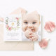 This beautiful and elegant Baptism thank you card features a frame of lovely pink watercolor roses with green leaves and faux rose gold accents, and soft grey text on a clean white background for a look that manages to be both trendy and vintage inspired. There is also a faux gold look cross and a spot for your personal photo. The back of the card features a matching floral frame on a soft, blush pink background.