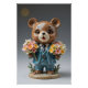 A charming ceramic figurine of an anthropomorphic bear cub in a whimsical, chibi-inspired style. The bear wears a neatly glazed blue suit, white shirt, and patterned dark tie, with glossy brown ceramic fur and large, expressive eyes conveying gentle awe. It stands upright, holding two colorful ceramic flower bouquets in pink, yellow, and white. The figurine rests on a simple ceramic base with delicate painted effects—a soft watercolor-like sun and sky, and tiny flowers sprouting at its feet. Finished with smooth, glossy glazes, the piece exudes warmth, innocence, and joyful handcrafted appeal.