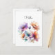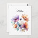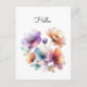 A watercolor illustration of pretty flowers in teal, peach, pink, purple, green. This botanical print is perfect for a simple Hello greeting, but you can change the text to your preferred greeting. AI assisted graphic purchased with commercial use. Artwork: DreamCafeArt