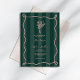 Wedding theme featuring text inside hand drawn pink frame with pink floral botanical line drawing over emerald green stripe background.