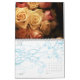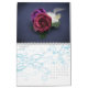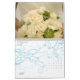 A customisable calendar to celebrate the year of your wedding. The front page features the unique "Bouquet Range" from Studio LUMIERE with a cream flowers set in the background in this photographic imagery with an overlay of the bride holding her bouquet of roses and foliage. Caligraphy script text with the word "Wedding" is watermarked in the base of the image. Text is customisable for the dates that the calendar commences and your names. Each month features one of the key details that make weddings beautiful at every sensory level: the flowers.