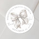 A classic and elegant white bow bridal shower sticker featuring an oversized soft white watercolor bow. At the top, it has the bride-to-be’s name and “Bridal Shower,” and at the bottom, the date. In the centre, next to the white bow, is “Thank You!” in graceful script. This simple and timeless bridal shower design uses grey text in a mix of serif and script typography, creating a refined yet charming look. You can customise the font colours and background to suit your style. Personalised Elegant Watercolor White Bow Bridal Shower Theme Thank You Sticker Label.