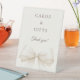 A soft ivory colored background, decorated with a pink bow. Text: Cards and Gifts. Thank you!