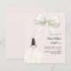 This sophisticated design features a large ivory bow adorned with delicate pearl details, paired with a graceful gown illustration. A soft blush pink colored background creates a modern, refined look that feels both luxurious and unforgettable.