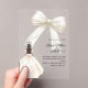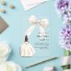 This sophisticated design features a large ivory bow adorned with delicate pearl details, paired with a graceful gown illustration. The transparent acrylic finish creates a modern, refined look that feels both luxurious and unforgettable.