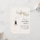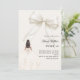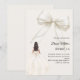 This sophisticated design features a large ivory bow adorned with delicate pearl details, paired with a graceful gown illustration. A soft ivory colored background creates a modern, refined look that feels both luxurious and unforgettable.