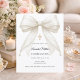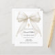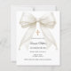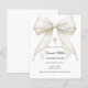 A white background, decorated with a large ivory colored bow with pearls and a golden cross. Personalize and add a name and details details.