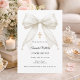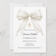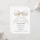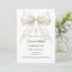 A white background, decorated with a large ivory colored bow with pearls and a golden cross. Personalize and add a name and details details.