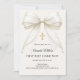 A soft ivory colored background, decorated with a large bow with pearls and a golden cross. Personalize and add a name and details details.