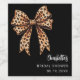 A black background. Decorated with a large bow with leopard print. Personalise and add the bride's name and a date. Black handwritten style script.