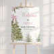 Sweet winter themed pink bow and pine tree baby shower welcomes sign featuring a large bow, a few pink flowers and snowflakes. This winter baby it's cold outside baby shower invitation is ideal for a baby girl's winter baby shower.