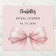 A blush pink coloured background. Decorated with a large bow. Personalise and add the bride's name and a date. Black handwritten style script.
