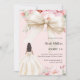 An elegant blush pink background, decorated with a large cream coloured bow, pink flowers and a girl in a cream coloured dress. Personalise and add a name and party details.