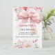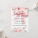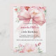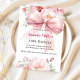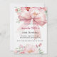 An elegant white background, decorated with a large pink bow and pink flowers. Personalise and add a name and party details.