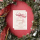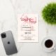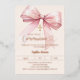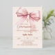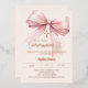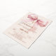 A soft cream colored background, decorated with a pink large bow and a golden cross. Personalize and add a name and details details. Real rose gold foil text.