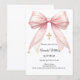 A white background, decorated with a large pink colored bow with pearls and a golden cross. Personalize and add a name and details details.