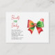 Red and green bow, Santa hat and snowflakes Christmas Santa Baby shower Books for baby enclosure card. This festive Christmas baby shower card is adorned with a prominent, impressive red and green bow covered with snow and with a snowflake at its center and a Santa hat. The phrase "Books for Baby" is written in script and decorative typography. The reverse includes a playful pattern of varying red and green stripes, interspersed with charming snowflakes and snow.