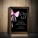 This stunning welcome poster features a sleek black backdrop, creating a bold and contemporary foundation. A beautiful blush pink bow takes a prominent place, its delicate strokes symbolising the joyous union and adding a vibrant pop of colour against the black. The celebratory phrase "She's tying the knot" is gracefully incorporated at the top in white script, perfectly setting the theme. Just below, the words "WELCOME TO" appear in a charming small white script, warmly inviting guests. The Guest of Honour's Name is prominently displayed in white script, ensuring everyone knows who the celebration is for. The words "Bridal Shower" are elegantly presented in a refined white script, and the date of the event is also included in white script, anchoring the occasion. To add an extra layer of excitement, a personalised final countdown is prominently featured in white script, such as "[X] days until she ties the KNOT," building anticipation for the wedding day. The overall aesthetic is one of bold romance, modern love, and striking detail, making this poster a sophisticated and interactive focal point for your celebration.