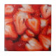 Photographic ceramic tiles of fresh red strawberries sliced in a bowl are ideal for any country kitchen decor The.closeup photography of heart-shaped sliced strawberries on these ceramic tiles is mouthwatering.