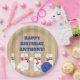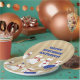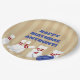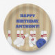 These paper plates are perfect for bowling alley birthday parties. They feature an illustration of a blue bowling ball with white and red pins set against a tan bowling lane background. Your custom message appears in bold blue lettering.