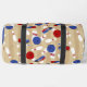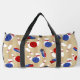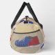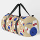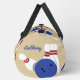 Tote your gear to the bowling alley in style with this personalised duffel bag. It's patterned with illustrations of bowling balls, bowling pins, and bowling shoes in red, white and blue against a tan background. On one side is a spot to add a name in blue script lettering.