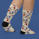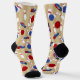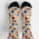 These socks are perfect for wearing on your next trip to the bowling alley. They feature illustrations of bowling balls, bowling pins and bowling shoes. The red, white and blue graphics are set against a tan striped background.