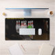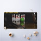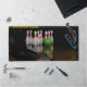 A desk mat featuring a photo of a bowling ball and bowling pins.