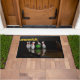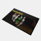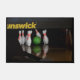 A doormat featuring a photo of a bowling ball knocking down bowling pins.