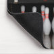 A mousepad featuring a photo of bowling pins about to be hit by a bowling ball.
