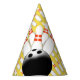 Bowling balls and pins make up this fun paper hat. Customisable so you can add your own text and change the background colour. Great for your next party!.