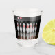 A shot glass featuring a photo of a rack of bowling pins.