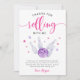 Cute bowling theme girl's birthday party thank you card featuring watercolor illustration of a bowling ball hitting some pins with pink and purple stars around. The text says "thanks for rolling with me."